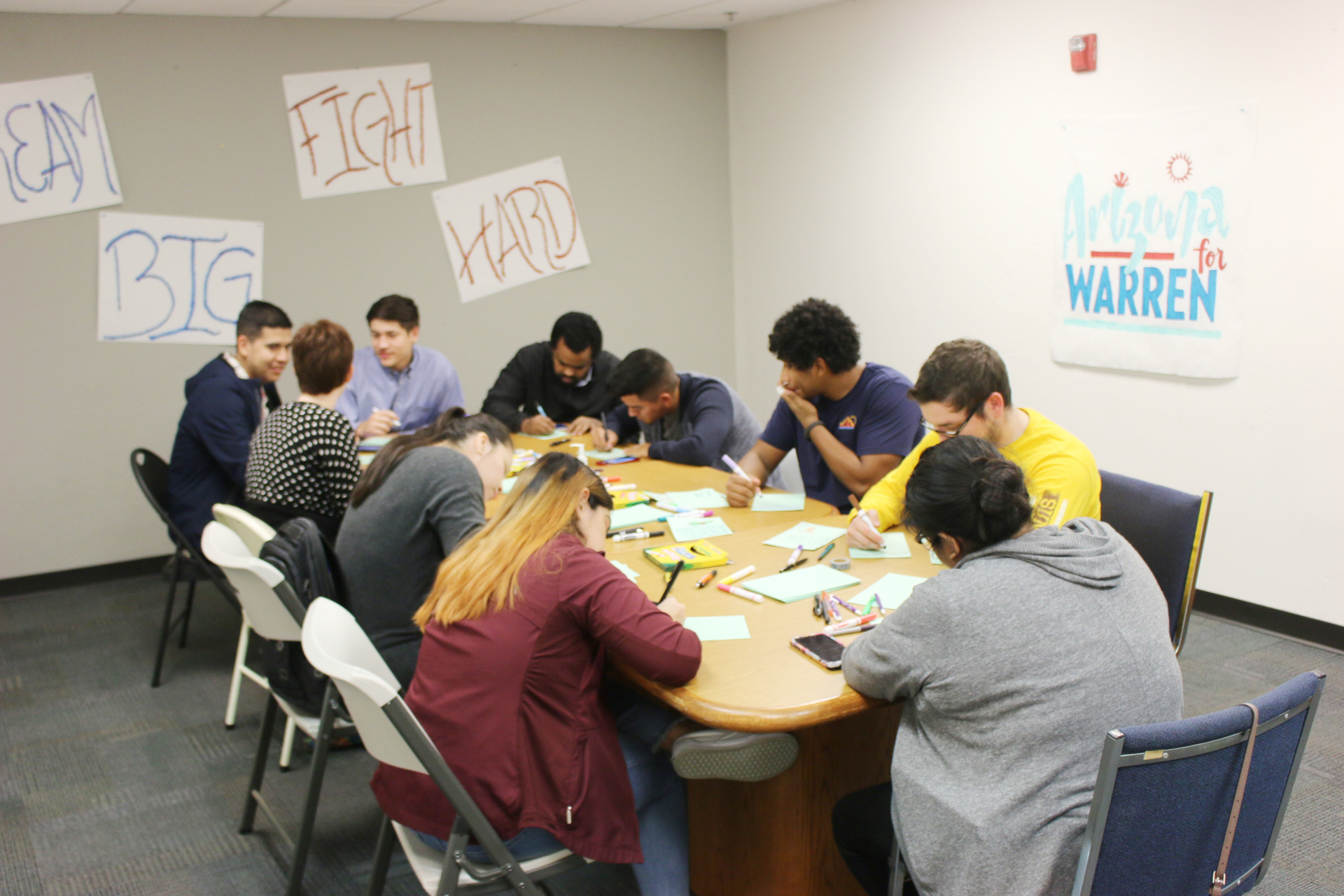 En lo que fue el Día del Migrante el pasado 18 de diciembre, en lo que es el comité de campaña de Warren for Arizona, se dieron cita jóvenes voluntarios para escribir tarjetas de navidad con mensajes de aliento para los refugiados que se encuentran en centros de asilo en México después de haber sido sacados de los Estados Unidos.
