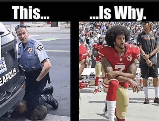 “Esta es la razón”, se tituló la imagen en una aparente referencia a la acalorada controversia sobre las protestas silenciosas de Kaepernick contra la brutalidad policial y el racismo durante la temporada 2016.
