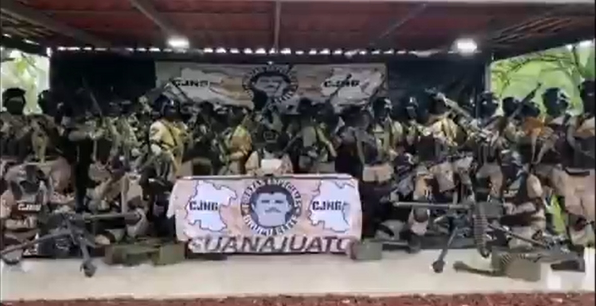 En el video aparecen al menos una veintena de personas encapuchadas, con vestimenta tipo militar y con armas de grueso calibre, quienes exhiben una lona para identificarse como elementos del “grupo élite” de la organización criminal que encabeza el capo Nemesio Oseguera, alias el Mencho.