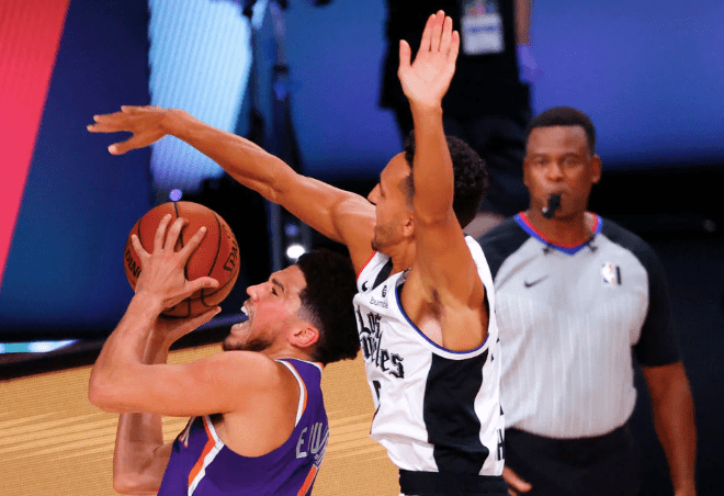 Booker se sacudió con una finta a Kawhi Leonard, uno de los mejores defensores del perímetro,para elevarse y lanzar un pase desvanecido por encima de Paul George sin tiempo restante.