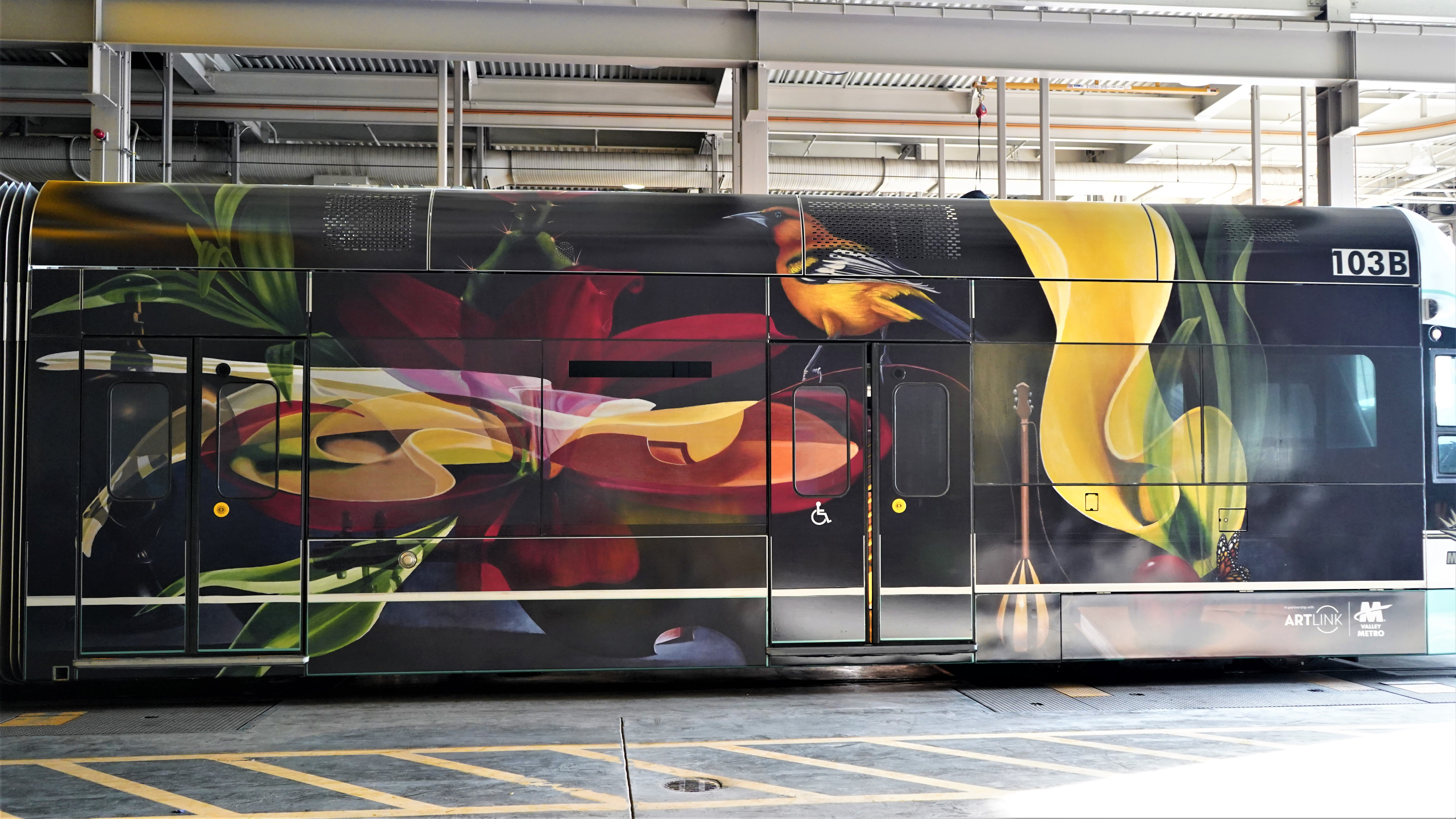 Caraveo es un artista local vinculado con las comunidades del área sur central y del centro de la ciudad de Phoenix y sus murales más conocidos tienen una vibra suave y al estilo de jazz, Caraveo creó un concepto completamente nuevo para el proyecto Artsline de Valley Metro.