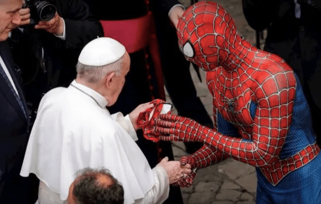 El papa Francisco saludó esta mañana a un hombre disfrazado del superhéroe Spiderman en la audiencia general con los fieles, que tiene lugar todos los miércoles en el patio de San Dámaso del Vaticano.