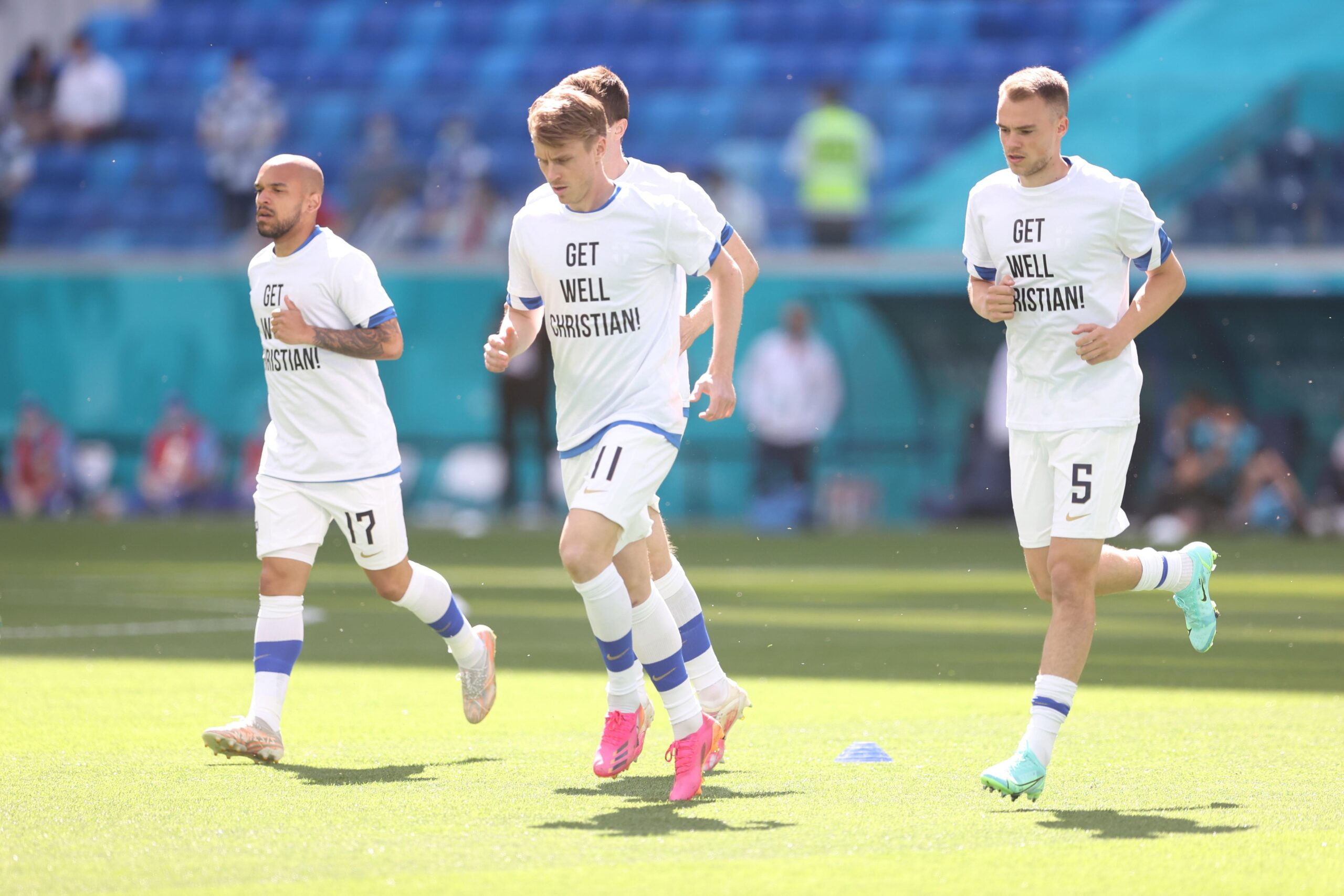 Los futbolistas finlandeses salieron hoy a calentar al estadio Krestovski con camisetas en las que le desean una pronta recuperación al danés Christian Eriksen, que sufrió un desvanecimiento en el partido que ambos equipos disputaron el pasado sábado.
