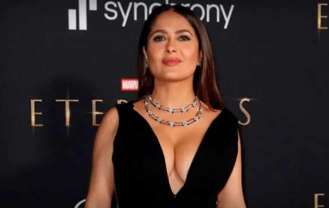 La mexicana Salma Hayek es uno de los nombres en mayúsculas de su reparto y esta noche acudió al estreno de la película con un espectacular vestido negro con un gran escote y toques dorados que remató con dos brillantes collares.
