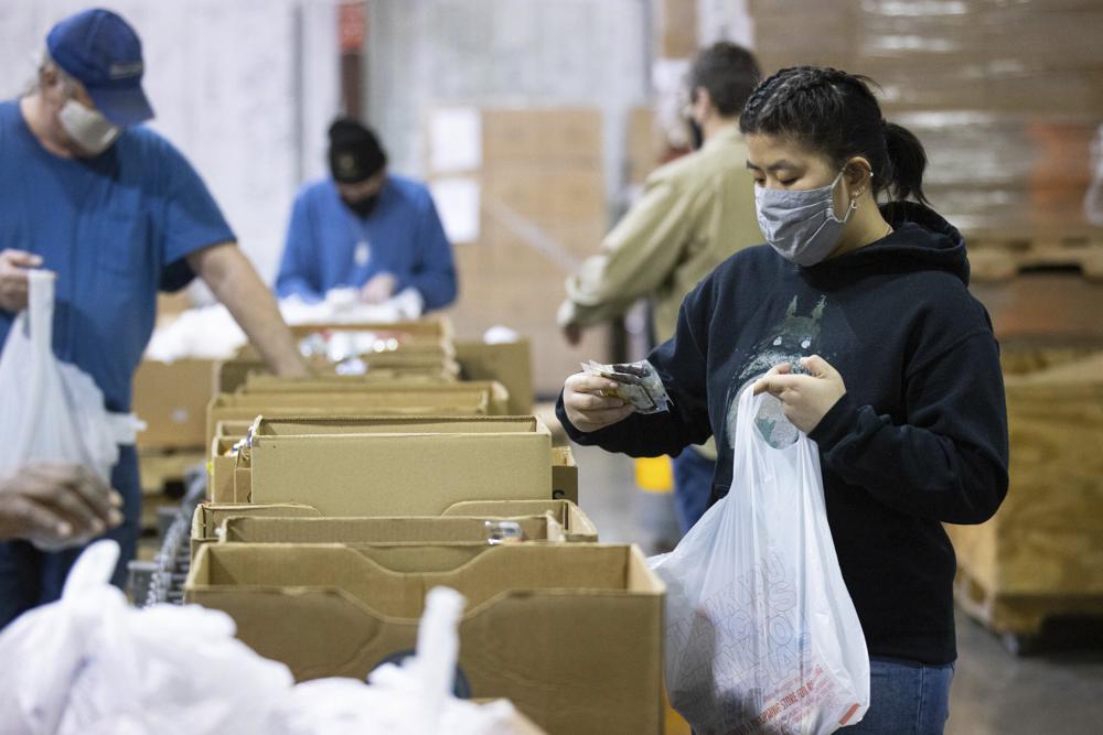 Los bancos de alimentos generalmente usan voluntarios para clasificar las donaciones y empacar cajas de productos listos para su distribución. Es una práctica común hacer arreglos para que empresas o escuelas locales envíen grandes grupos de voluntarios, pero eso ha dejado al sistema vulnerable a que esas instituciones se retiren todas a la vez.