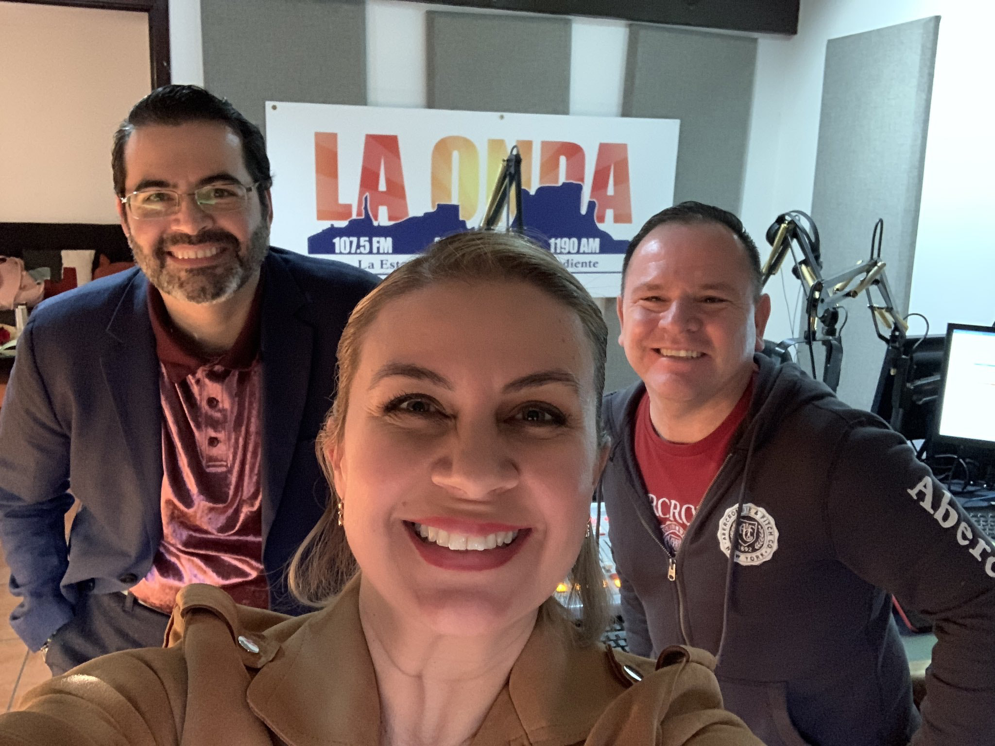 Maritza L. Félix (conducción), Johnny Córdoba (producción) y Ulises Ortez (operación técnica), en la Hora del Cafecito, en la Radio Onda 1190 AM – 107.5 FM. FOTO / CONECTA ARIZONA