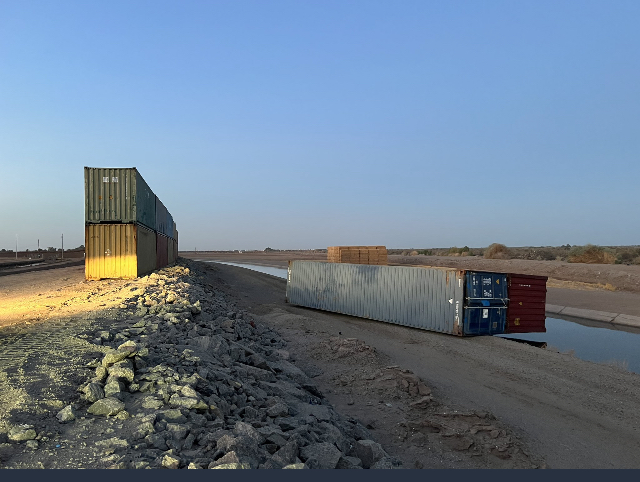 Los contenedores que fueron enviados por el gobernador Doug Ducey para llenar huecos en la franja fronteriza entre Arizona y Sonora en el área cercana a Yuma amanecieron en fuera de su lugar en el suelo.