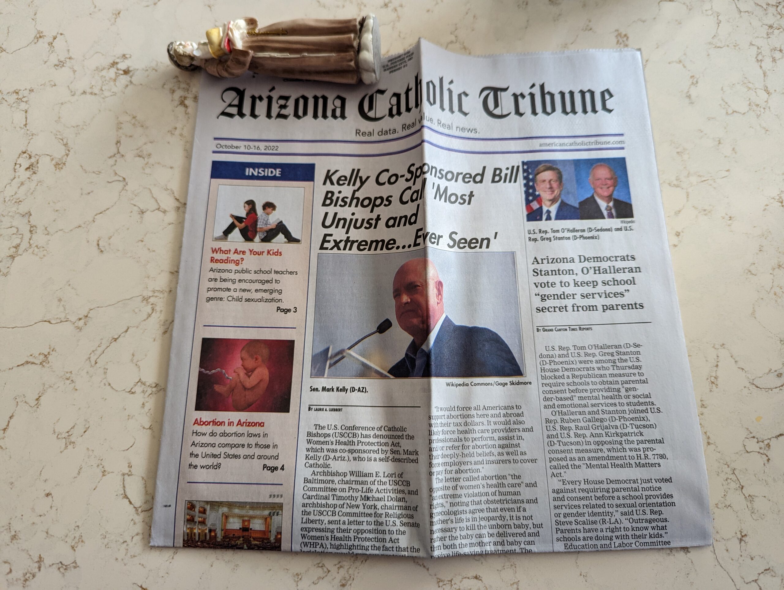 Imagen del periódico Arizona Catholic Tribune que fue entregado por correo, con una cobertura fuertemente partidista disfrazada de noticias locales.