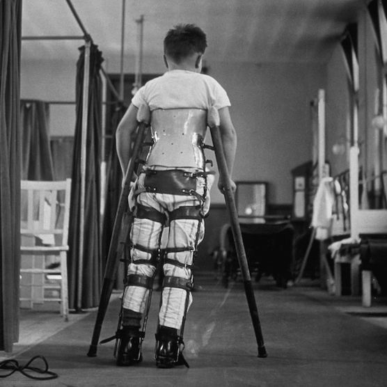 Un niño con polio aprendiendo a caminar en el Hospital Queen Mary, en Londres, en 1947. Fotografía por George Konig/Keystone Features/Getty Images.